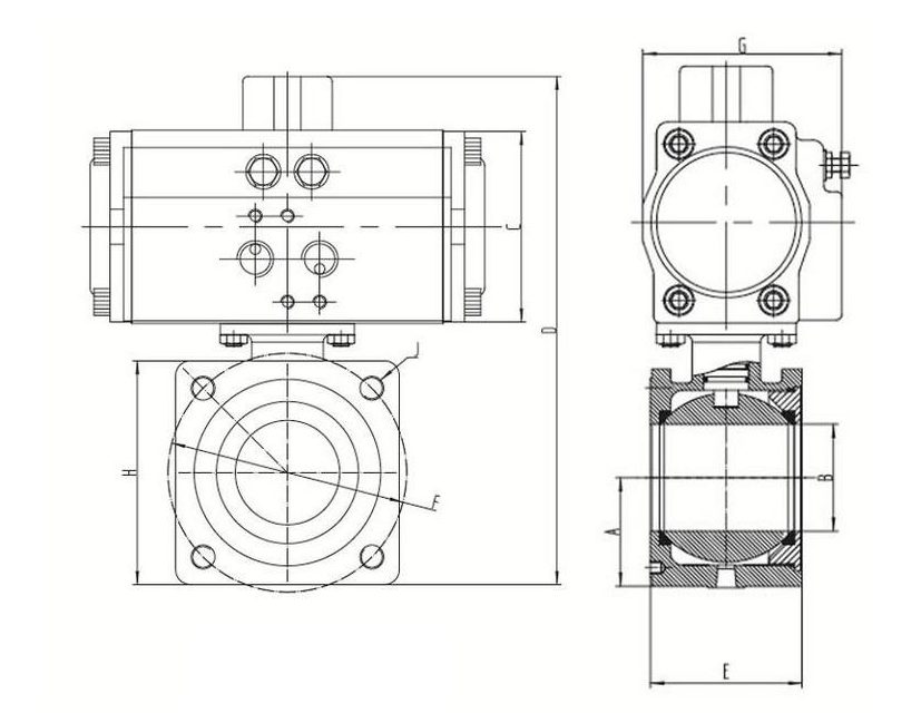 氣動方球閥主要用鑄鐵、不銹鋼、聚四氟乙烯等加工而成。主要結構及連接尺寸如下圖及表