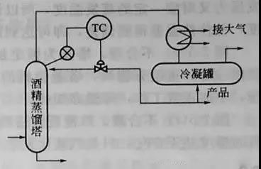 由所求得F=2來看,似乎應該控制兩個參數才合理。但是由圖可知,冷凝罐上部通大氣,因此實際上已恒定了冷凝罐與蒸餾塔的壓力,客觀上塔壓已被控制,因此用塔頂溫度作為被調參數是合理的。