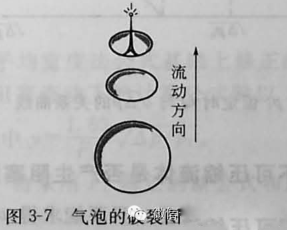 二是產(chǎn)生汽蝕,如圖3-7所示,產(chǎn)生空化作用時,在縮流處的后面由于壓力恢復(fù),升高的壓力壓縮氣泡,達到臨界尺寸的氣泡開始變?yōu)闄E圓形,接著在上游表面開始變平,然后突然爆裂。所有的能量集中在破裂點上,產(chǎn)生極大的沖擊力。如果氣泡在接近節(jié)流孔后的固體表面處破裂,這種沖擊力會慢慢地撕裂材料表面,形成類似于煤渣的粗糙表面。