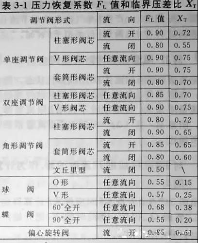 知FL是在閥門產(chǎn)生閃蒸時閥前后壓差△Pc與縮流處壓差△Pvc之比。用透明閥體做試驗將會發(fā)現(xiàn),當節(jié)流處產(chǎn)生閃蒸,即在節(jié)流處產(chǎn)生氣泡群時,Q就基本上不隨著△P的增加而增加。這個試驗說明:產(chǎn)生閃蒸的臨界壓差就是產(chǎn)生阻塞流的臨界壓差,測定此時的閥前后壓差△Pc和縮流處壓差△Pvc,便可求得壓力恢復(fù)系數(shù)FL,F(xiàn)L值的大小取決于調(diào)節(jié)閥的結(jié)構(gòu)形狀。由試驗確定的各類閥的FL值見表3-1