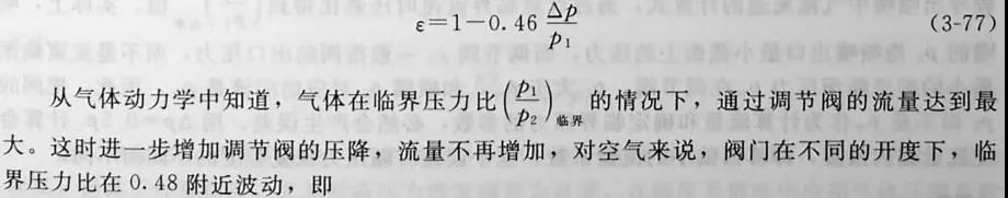對(duì)不可壓縮流體——液體的一般計(jì)算公式,各個(gè)都差異不大,而對(duì)于可壓縮流體則不同。可壓縮流體流量系數(shù)的計(jì)算比一般液體要復(fù)雜,其原因是可流體經(jīng)節(jié)流之后體積膨脹、密度減小,而且在P1不變和△P增加到一定程度時(shí),通過(guò)節(jié)流孔后會(huì)達(dá)到臨界狀態(tài),產(chǎn)生阻塞流,因此必須考慮這些因素的影響而對(duì)計(jì)算公式加以修正。主要的氣體流量系數(shù)計(jì)算公式見(jiàn)表3-5。