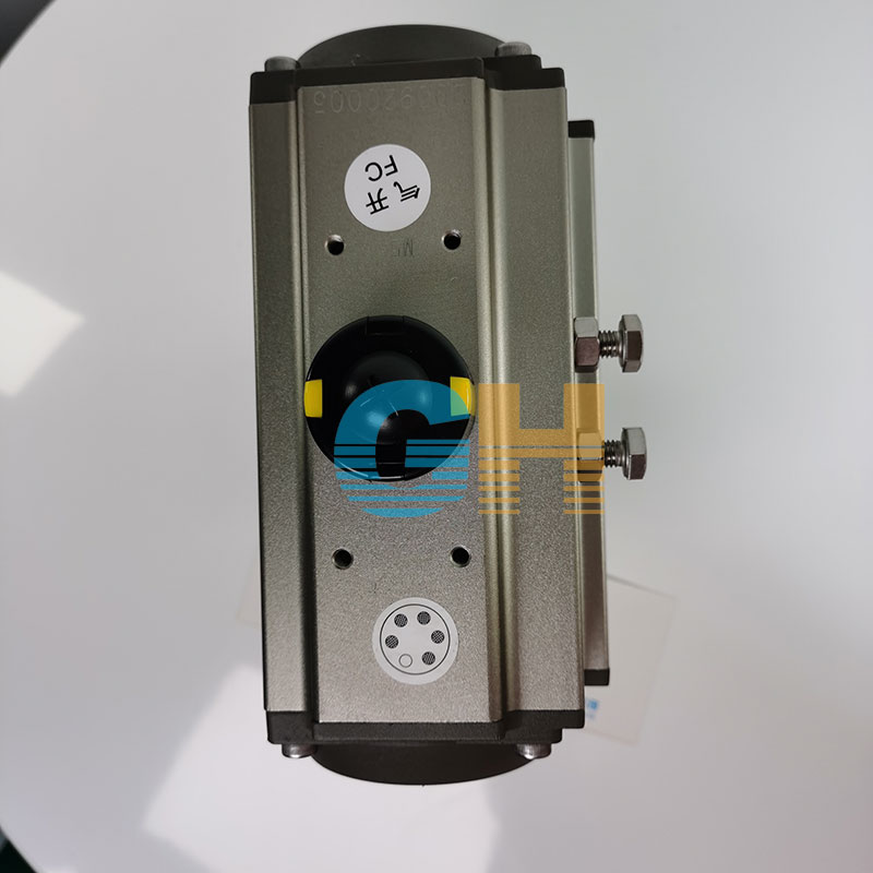 氣動(dòng)執(zhí)行器頂部連動(dòng)可視器,當(dāng)綠色標(biāo)志指向“開”字時(shí)標(biāo)志閥門開啟。