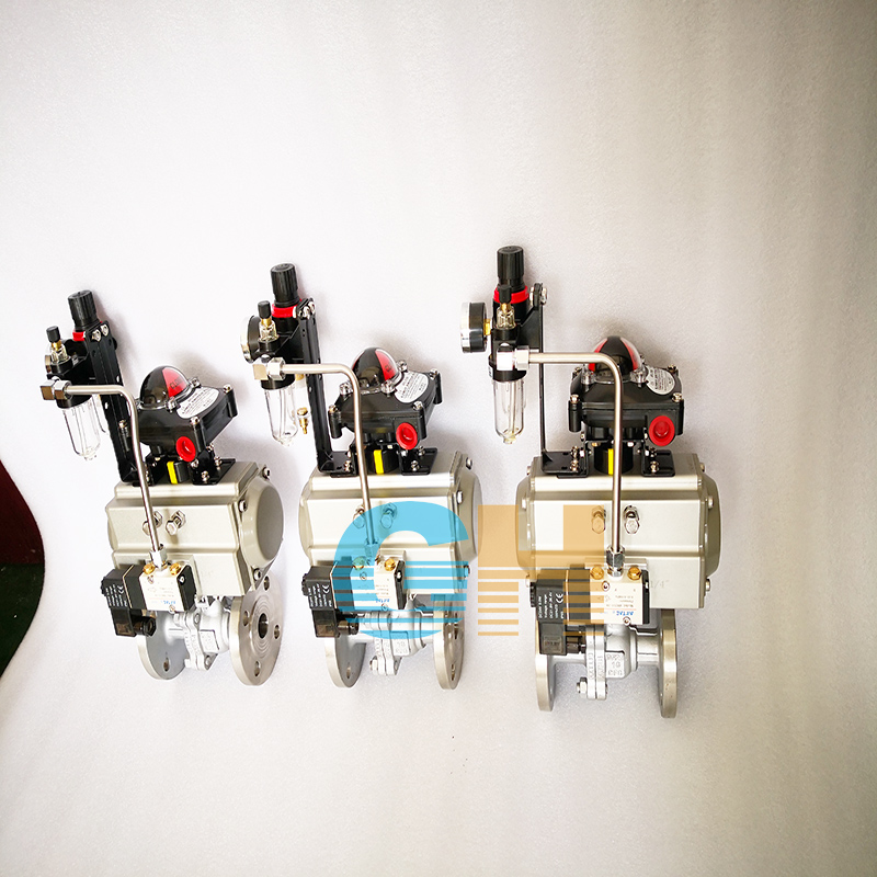 氣動(dòng)球閥有O型球閥和V型球閥之分。O型球閥采用浮動(dòng)式結(jié)構(gòu),球芯為精密鑄件,外表鍍硬鉻處理,閥座采用增強(qiáng)聚四氟乙烯材料,流道口與管道口徑相同,流通能力極大,流阻極小,關(guān)閉時(shí)無(wú)泄漏,一般做開(kāi)關(guān)閥使用,特別適用于高粘度;V型球閥采用固定式結(jié)構(gòu),球芯上開(kāi)有V型切口,可實(shí)現(xiàn)剪切含纖維、顆粒狀介質(zhì)。根據(jù)工藝設(shè)備不同可選用氣動(dòng)或電動(dòng)執(zhí)行機(jī)構(gòu),分別組成氣動(dòng)球閥和電動(dòng)球閥,其中氣動(dòng)球閥如要實(shí)現(xiàn)比例調(diào)節(jié)須配閥門(mén)定位器電動(dòng)球閥如要實(shí)現(xiàn)比例調(diào)節(jié)須選電子式電動(dòng)執(zhí)行機(jī)構(gòu)或配伺服放大器等