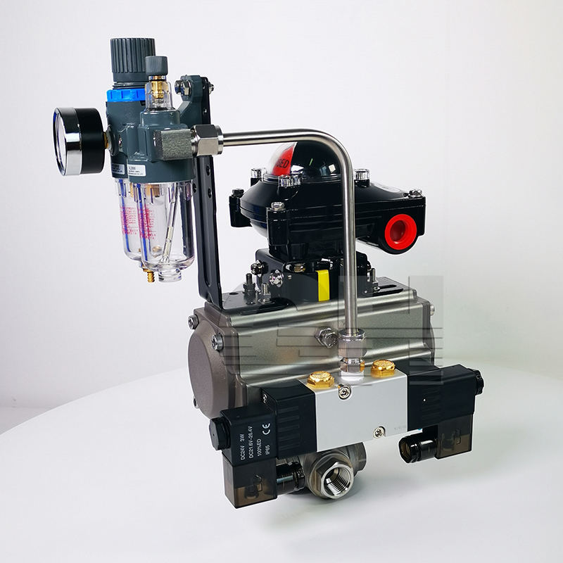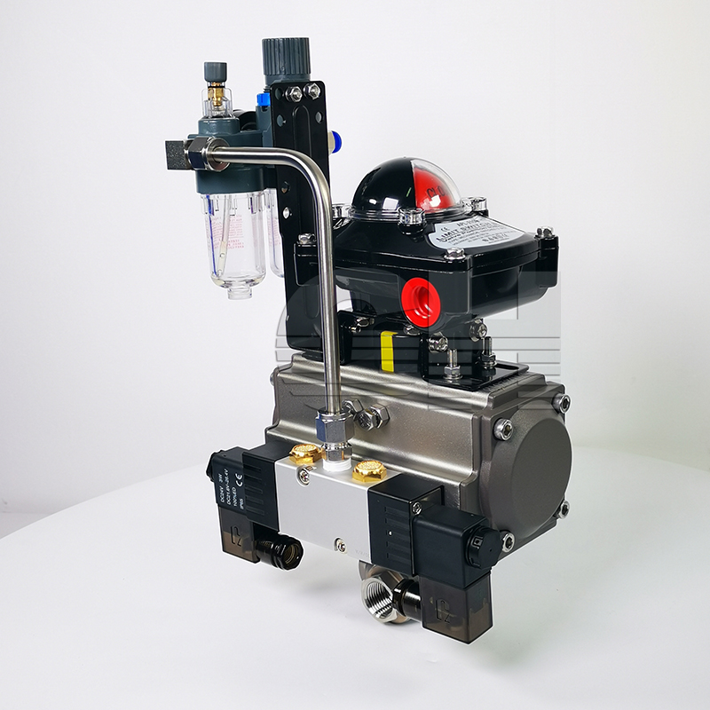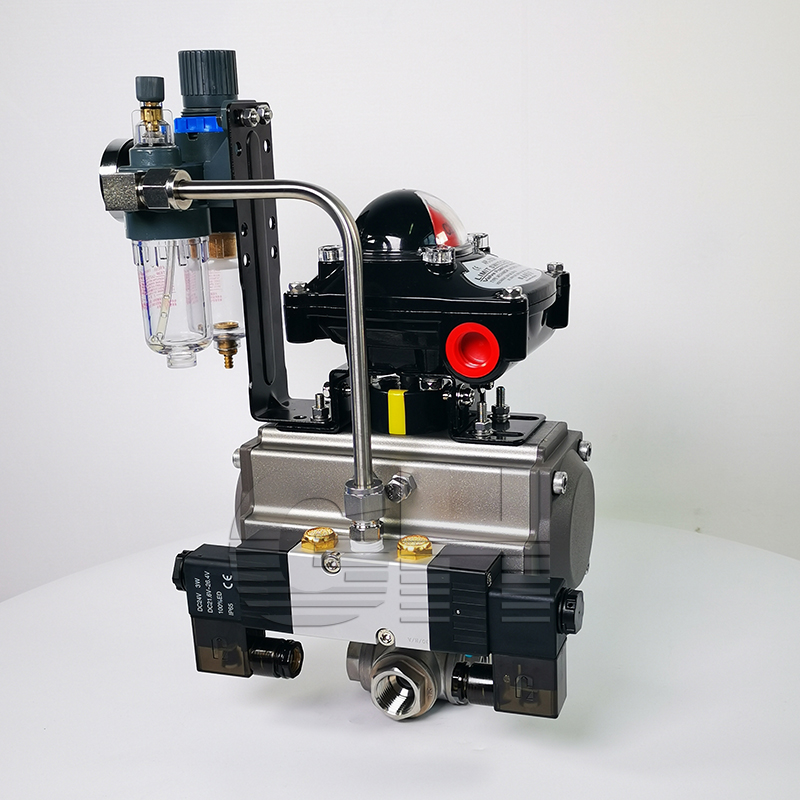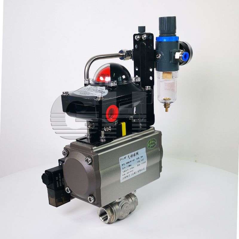 氣動內螺紋(對焊 式)球閥是由雙(單)作用氣動 活塞式執行器和內螺紋(對焊式)球閥組 成。其閥體可 分為整體式、二段式、 三段式。閥座采用彈性密封結構,密封可靠,啟閉輕松。閥桿采用有倒密封的下裝式結構,閥腔異常升壓時,閥桿不會被沖擊。氣動活塞式執行器采用低摩擦材料做 成軸承套,缸體內外表面經硬質陽極氧化防腐處理,大大提高了氣缸的使用。本產品使用性能穩定,廣泛的用于石化、冶金、電力、輕工、醫藥等工業部門。工作原理當氣動執行器與 電路和系統氣源接通后,空氣通過管道A或B管進入A缸(B缸)推動活塞向一端運動,從而帶動旋轉軸和球芯轉動90°□氣動執行器頂部連動可視器,當綠色標志指向“開”字時標志閥門開啟。□回信器信號燈綠燈亮時閥門處在開啟位置,而紅燈亮時閥門處在關閉位置□定位器可調節