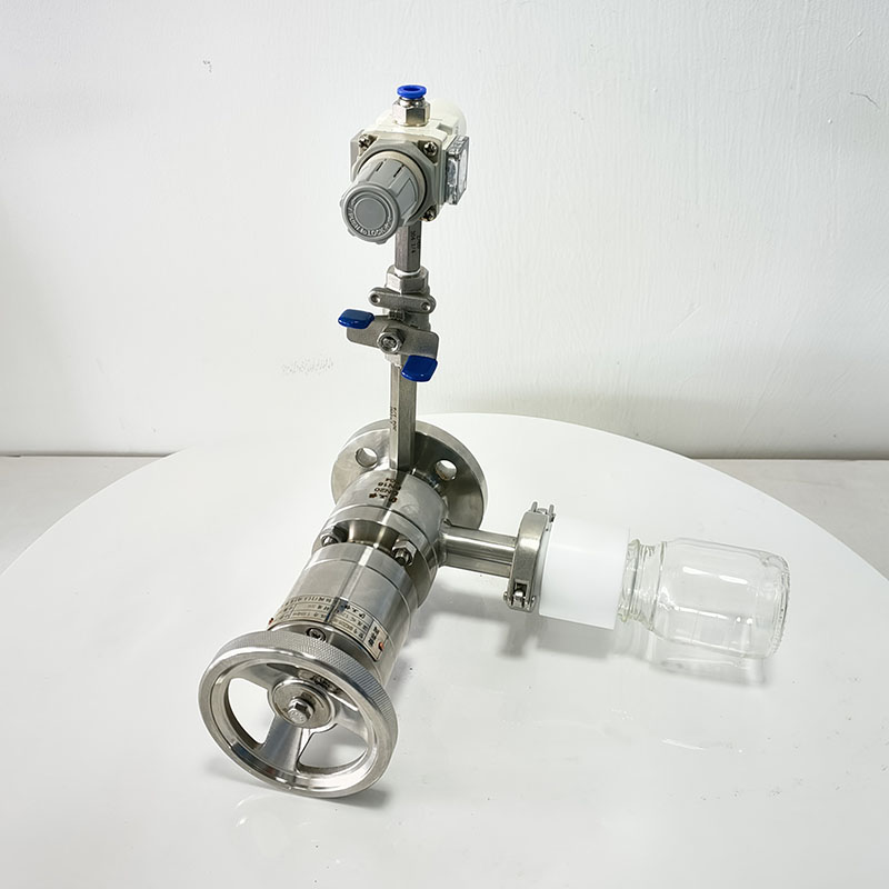 罐底側(cè)裝取樣閥-帶吹掃采用全襯氟設(shè)計(jì),可以在腐蝕性工況的取樣,解決特材造價(jià)高的問題,罐底側(cè)裝取樣閥-帶吹掃主要有襯氟閥體、襯氟閥芯、襯氟閥桿、閥座、氣動(dòng)執(zhí)行機(jī)構(gòu)、取樣瓶組成,取樣瓶為可拆卸設(shè)計(jì),試樣進(jìn)入取樣瓶?jī)?nèi),可將取樣瓶密封,避免污染試樣,流道無流阻設(shè)計(jì),不影響流量,閥桿通過手柄、電動(dòng)執(zhí)行機(jī)構(gòu)、氣動(dòng)執(zhí)行機(jī)構(gòu)旋轉(zhuǎn)帶動(dòng)閥桿及閥芯使試樣進(jìn)入閥芯內(nèi),通過旋轉(zhuǎn)閥芯180°實(shí)現(xiàn)試樣進(jìn)入取樣瓶?jī)?nèi),放樣的同時(shí),閥芯將取樣口關(guān)閉,從而做到零泄漏及無壓取樣,不會(huì)因開關(guān)閥門對(duì)取樣瓶造成壓力沖擊,從而保證操作者的安全。取樣瓶可選透明和避光兩種,本取樣閥廣泛應(yīng)用在制藥、化工、食品行業(yè)。