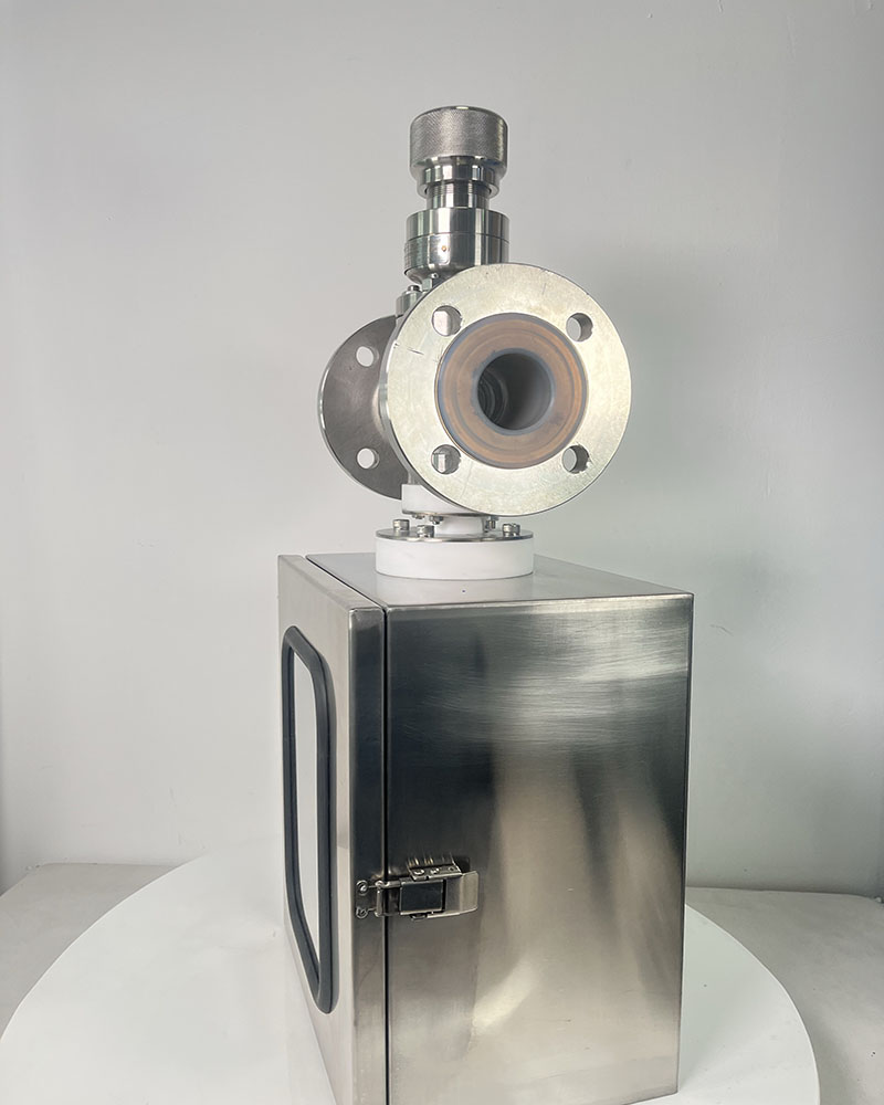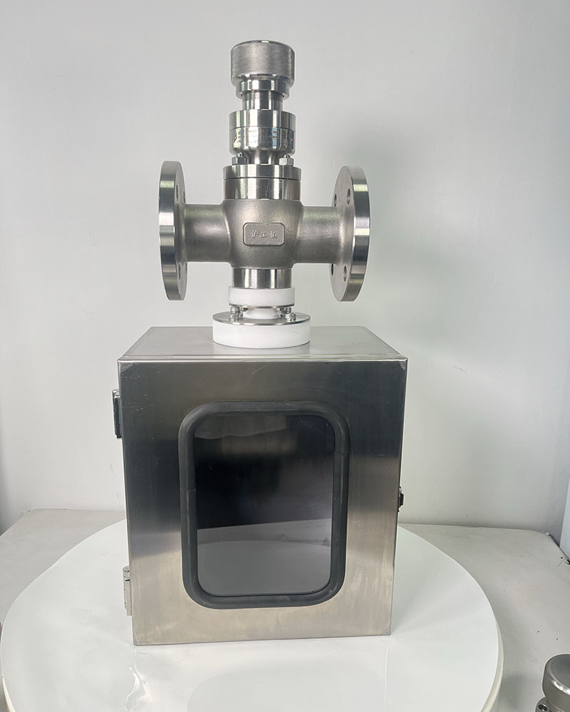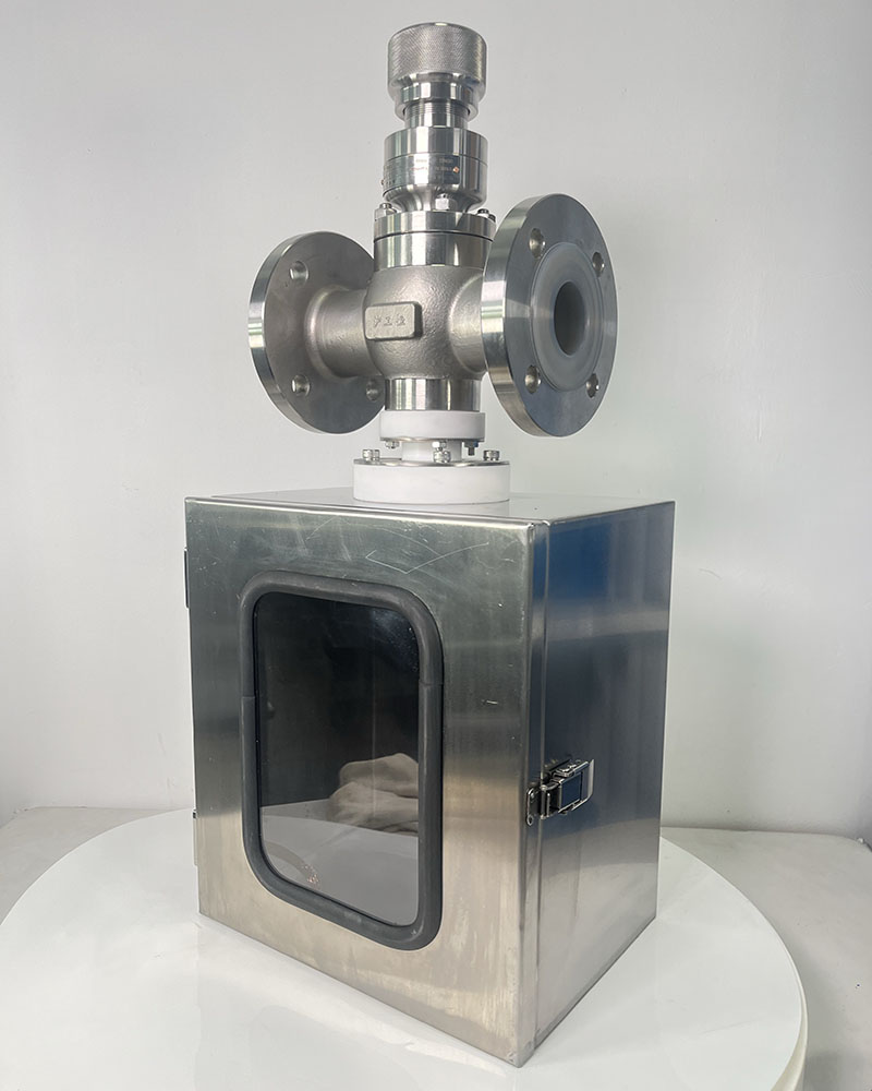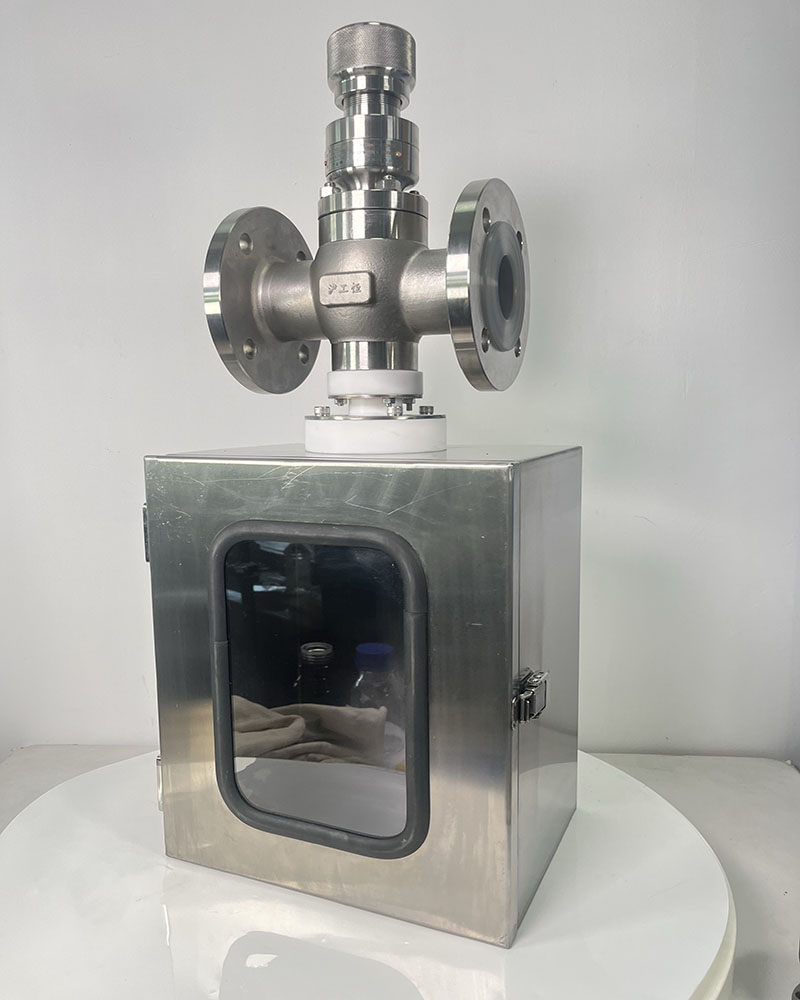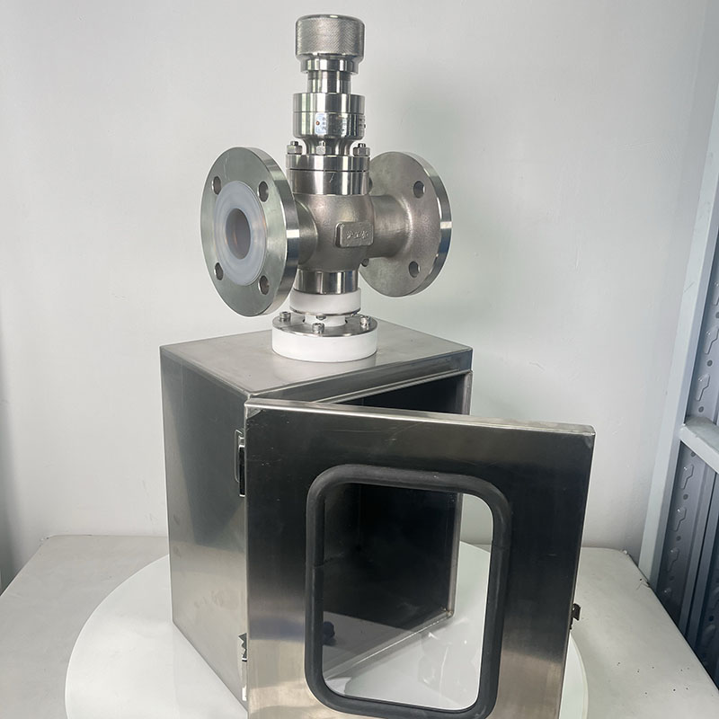 不銹鋼在線襯氟取樣閥-帶安全箱采用全襯氟設計,可以在腐蝕性工況的取樣,解決特材造價高的問題,不銹鋼在線襯氟取樣閥-帶安全箱主要有襯氟閥體、襯氟閥芯、襯氟閥桿、閥座、氣動執行機構、取樣瓶組成,取樣瓶為可拆卸設計,試樣進入取樣瓶內,可將取樣瓶密封,避免污染試樣,流道無流阻設計,不影響流量,閥桿通過手柄、電動執行機構、氣動執行機構旋轉帶動閥桿及閥芯使試樣進入閥芯內,通過旋轉閥芯180°實現試樣進入取樣瓶內,放樣的同時,閥芯將取樣口關閉,從而做到零泄漏及無壓取樣,不會因開關閥門對取樣瓶造成壓力沖擊,從而保證操作者的安全。取樣瓶可選透明和避光兩種,本取樣閥廣泛應用在制藥、化工、食品行業。