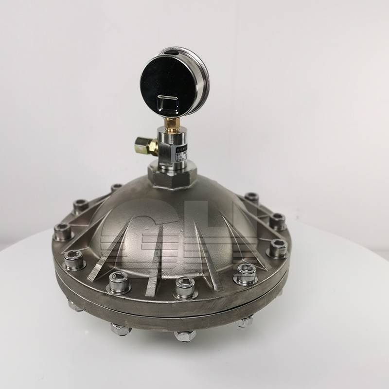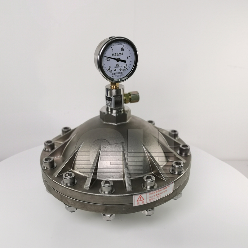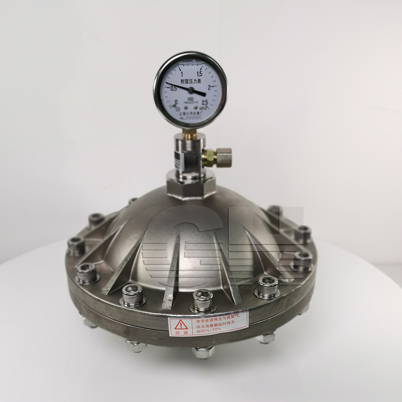 膜片式脈沖阻尼器分為上下殼體,中間由聚四氟乙烯&橡膠復(fù)合膜片分隔,是常用的脈沖阻尼器。 的優(yōu)點(diǎn)就是隔膜將預(yù)充氣體和管路中的液體分開,方便維護(hù),在合適的選型、充壓條件下,能夠減少 大多數(shù)的脈沖。我公司生產(chǎn)的膜片式脈沖阻尼器PVC材質(zhì)的 耐壓為1.0MPa,不銹鋼材質(zhì) 耐壓一般為2.5MPa,耐壓5.0MPa。