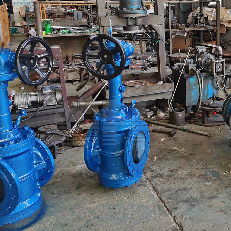 主要零部件有閥體、閥芯、閥瓣(嵌主密封圈)、端蓋、底盤、填料等。閥芯與閥瓣是閥體部分的核心。閥芯通過上、下耳軸固定于閥體內(nèi),中間為流道口,兩側(cè)為斜楔面,在該楔面上銑有燕尾導(dǎo)軌同左右兩片閥瓣相連。閥瓣是主密封件,閥瓣的表面為圓柱面,可達到B級硬密封精度,在該圓柱面上銑有一圈溝槽,模壓硫化的方法在其中yong久嵌有主密封圈(氟化橡膠或ding腈橡膠等),當閥門關(guān)閉時可形成硬軟密封。工作原理